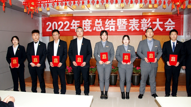 2023年1月12日上午,公司2022年度总结暨表彰大会在金豪商务九楼多功能厅隆重举行。大会上,公司总经理深入阐述了2022年度工作总结、对2023年度工作目标作详细布署,并同工程副总、行政副总、业务副总为获得2022年度优秀团队奖、优秀员工奖、执行力奖、优秀共产党员奖、廉洁自律奖、敬业奖的员工颁发了荣誉证书。