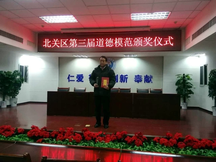 我公司业务副总经理赵武装同志,作为一名共产党员,时时处处以党员的标准严格要求自己,在政治理论学习、联系群众和遵纪守法等方面都能较好的发挥共产党员的先锋模范作用,以饱满的工作热情、扎实的工作作风、优异的工作成绩和全心全意为企业和职工群众办好事、办实事的精神,模范地践行了共产党员的先进性,赢得了广大职工的称赞和尊重。鉴于此赵武装同志被授予"2015年度北关区第三届道德模范提名奖"称号。