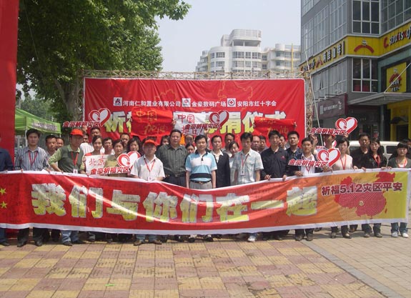 2008年5月18日上午,河南仁和置业有限公司及子公司金豪数码广场近300名员工自发组织了“祈福灾区”抗震救灾献爱心捐款活动,在短短1个小时内,员工们共捐出29581元现金支援四川地震灾区。河南仁和置业有限公司通过安阳红十字会累计向灾区累计捐款129581元。